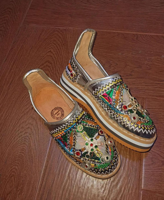 اكتشفي مجموعة بلغة تافراوت التقليدية المصنوعة يدوياً بعناية فائقة من جلد طبيعي فخم، والمزينة بنقوش أمازيغية مستوحاة من تراث الجنوب المغربي. تصاميمنا تجمع بين الراحة والأناقة، وتُعد خياراً مثالياً للمرأة العربية العاشقة للأصالة والتميز، خاصة في المناسبات أو الإطلالات اليومية الراقية.